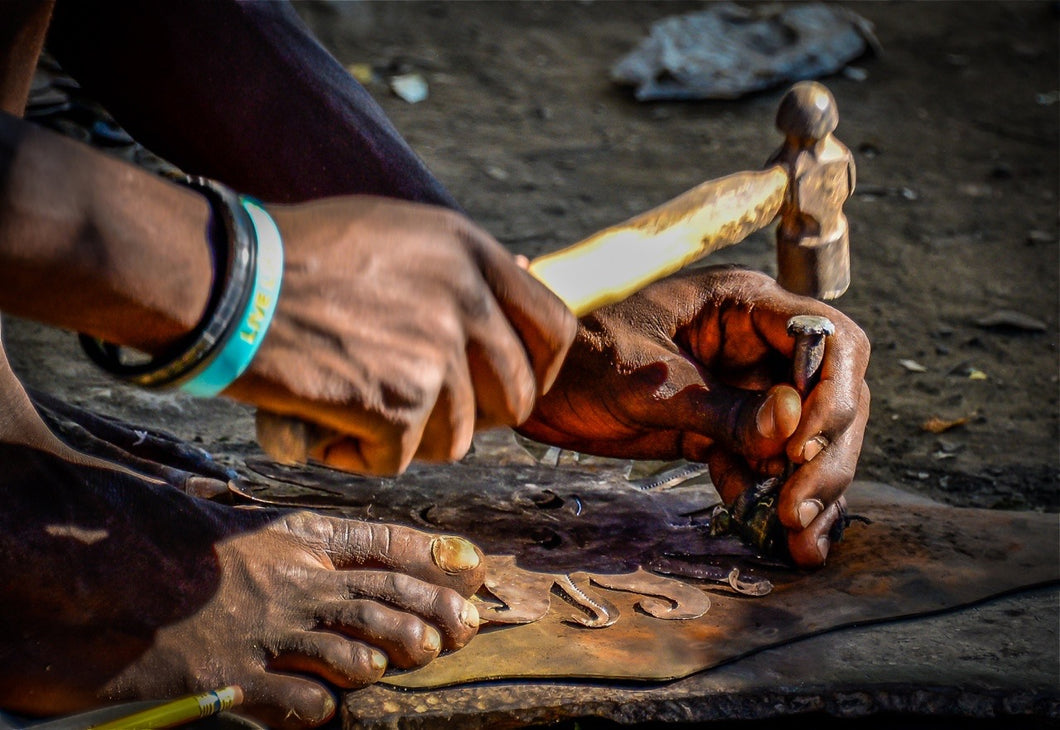 Hand made Haitian metal art. Using a recycled 55-gallon oil drums, Haitian artists cut and flatten the oil drum. Then with chalk, the design is drawn onto the metal sheet. Using a hammer, chisel and various primitive tools, the shape is cut and the various decorative patterns are pounded into the metal, creating a unique piece of amazing art. The finished design is signed by the artist and coated with a protective finish.